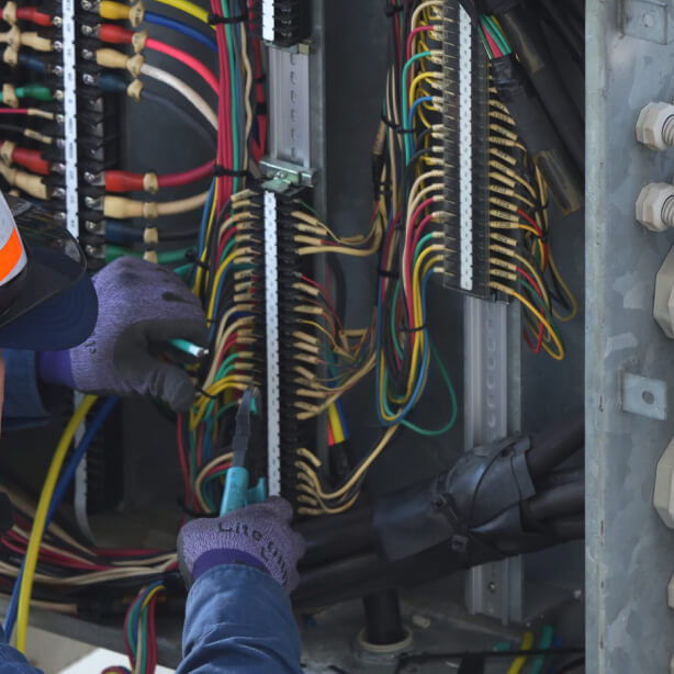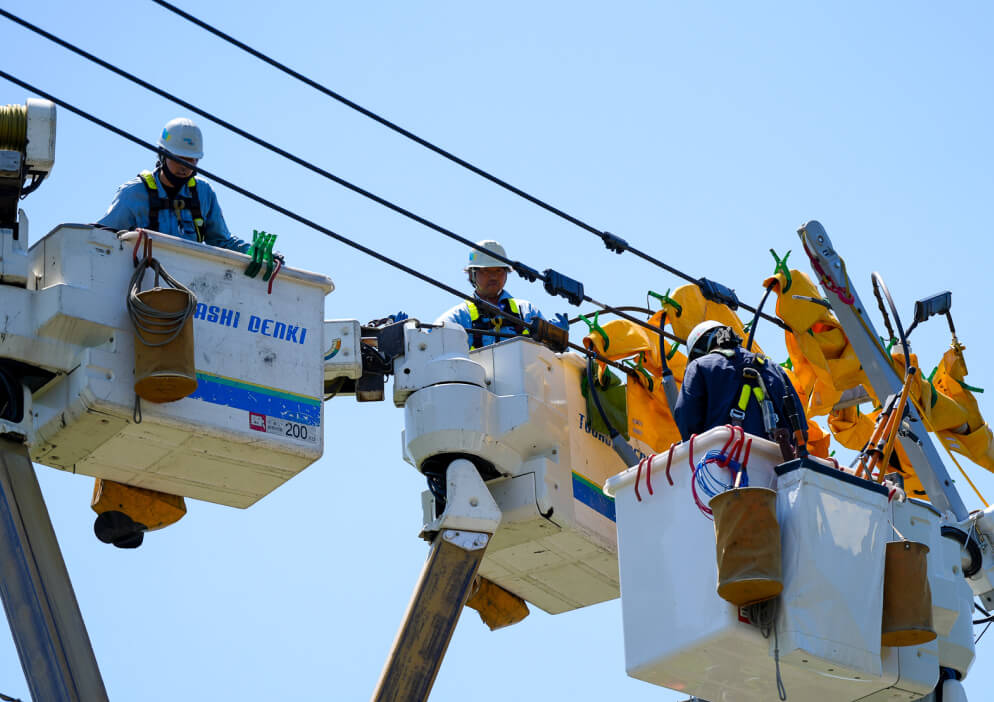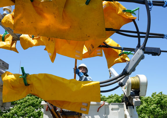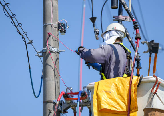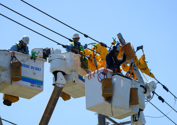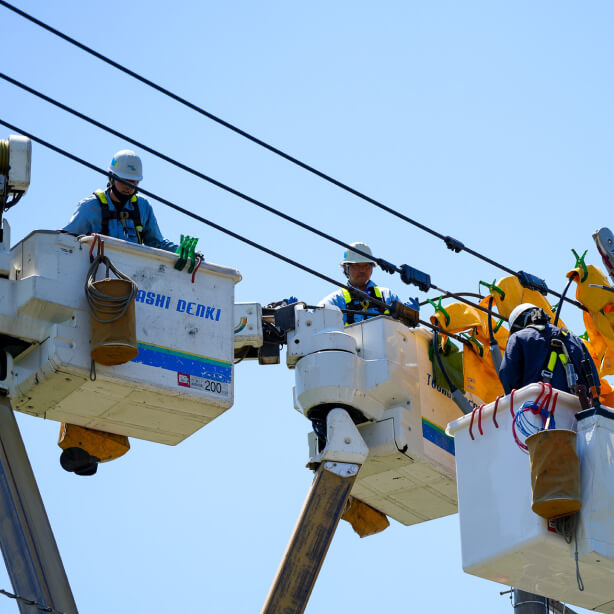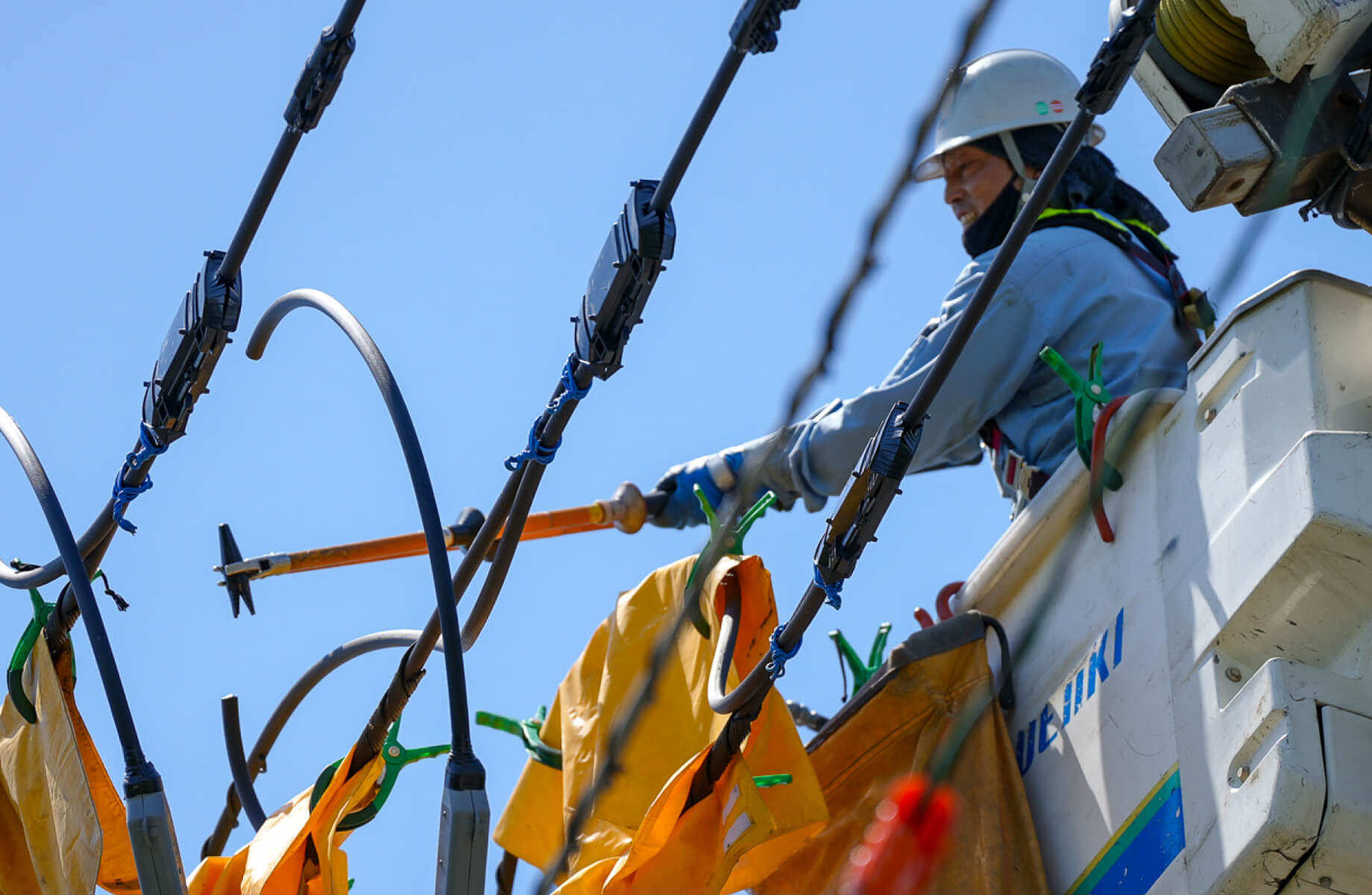 配電工事部では、電柱の建て替えや電線の張り替え、配電設備の設置・修理・点検などを通じて、安全で安定した電力供給を支える施工を担当しています。また、災害時の復旧対応といった緊急性の高い現場にも迅速に対応し、地域の暮らしを守るための重要な業務も行っています。